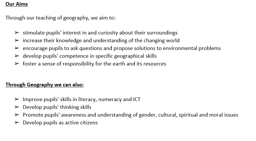 In an ever-changing world it is vital now more than ever to explore and develop our understanding of the planet we live in. As Geography lead I believe it is incredibly important to foster in children an interest and understanding of diverse places, people, resources and environments; together with a deep understanding of the Earth’s key physical and human processes. Geography’s many cross-curricular links allow it to further develop skills explored in other subjects and presents a range of opportunities to collect and analyse data, research and explore different sources of information.