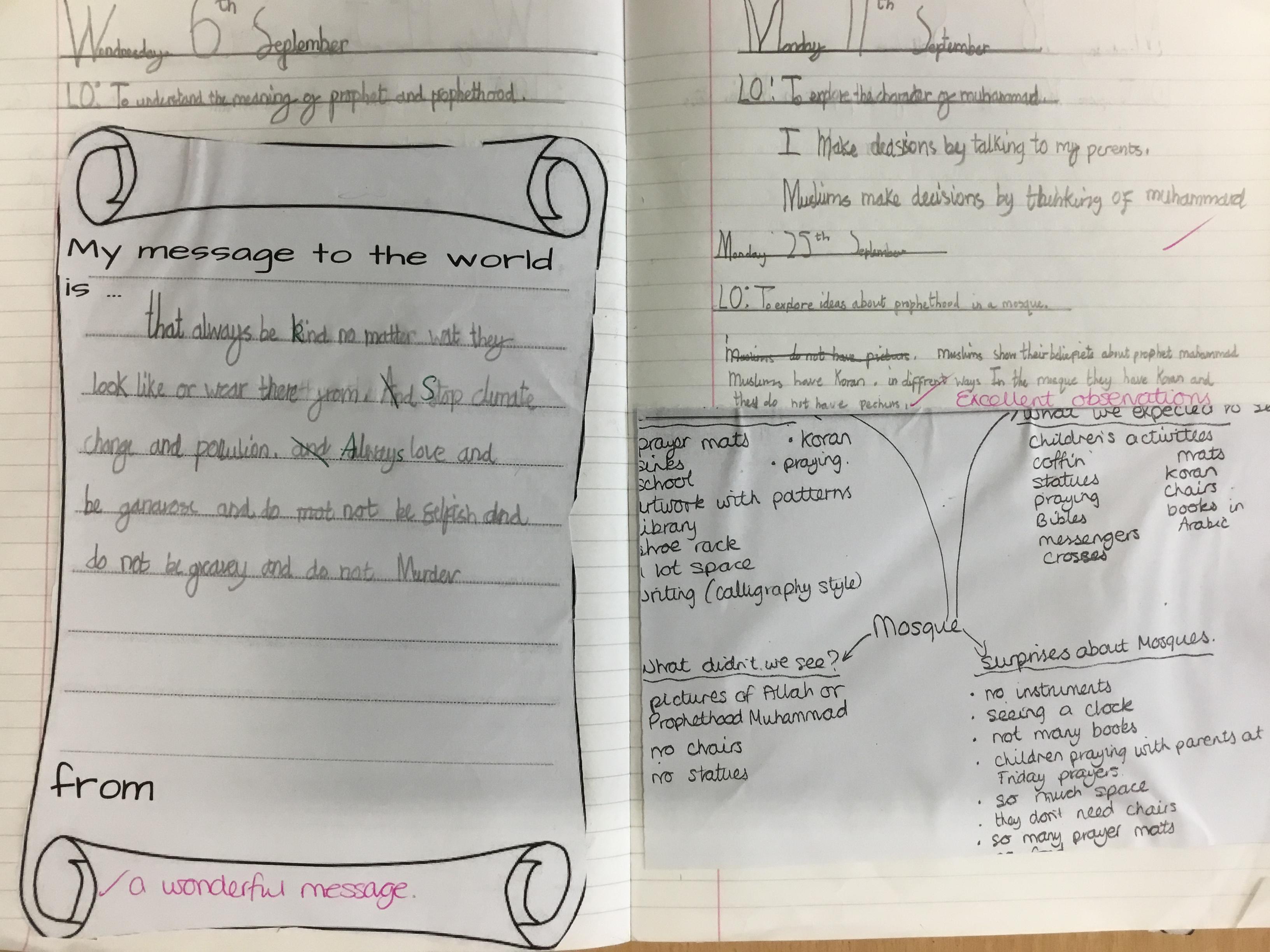 These faiths are taught throughout the school, using the Emmanuel Project, which is based on the Suffolk Agreed Syllabus.  Each half term the children learn and focus on a key belief or concept, which is central to the teaching and learning.  These concepts are explored through different faiths throughout the child’s RE Learning Journey.  The enquiry cycle model is used to develop each unit - Engage, Enquire, Explore, Evaluate and Express.   Each unit helps to develop the children’s thinking and shows progression within RE.  Within the lessons the children have the opportunity to learn through a variety of ways, including Drama, Art, Writing, small group discussions and music.  In EYFS, the Teachers carefully document the pupils' learning via our whole school Assessment Tool - Learning Ladders. In Key Stage 1, the children's Learning Journey is recorded via detail whole Class Books. The pupils in Key Stage 2, are provided with individual exercise books, in which they are able to take ownership of how their Learning Journey is recorded. This is a space for them to express their thoughts, opinions and questions that they may have, and they reflect the knowledge and understanding that the children have gained.